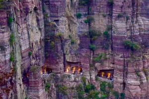早餐后,出发前往【万仙山景区】。我们将徒步行走这世界第九大奇迹——【郭亮挂壁公路】,亲身感受十三位壮士锲而不舍的精神。站在【崖上人家】观景台上,200余米高的赤红色太行绝壁在你的面前,在你的心里横冲直撞。挂壁公路横挂其上,如梦如幻。来到【炮楼】,远处轿顶山如天宫一般,镶嵌在数百米的绝壁之上,何其壮观。在【天梯】,我们还能看到老一辈郭亮人对外沟通的唯一道路挂在崖壁之上