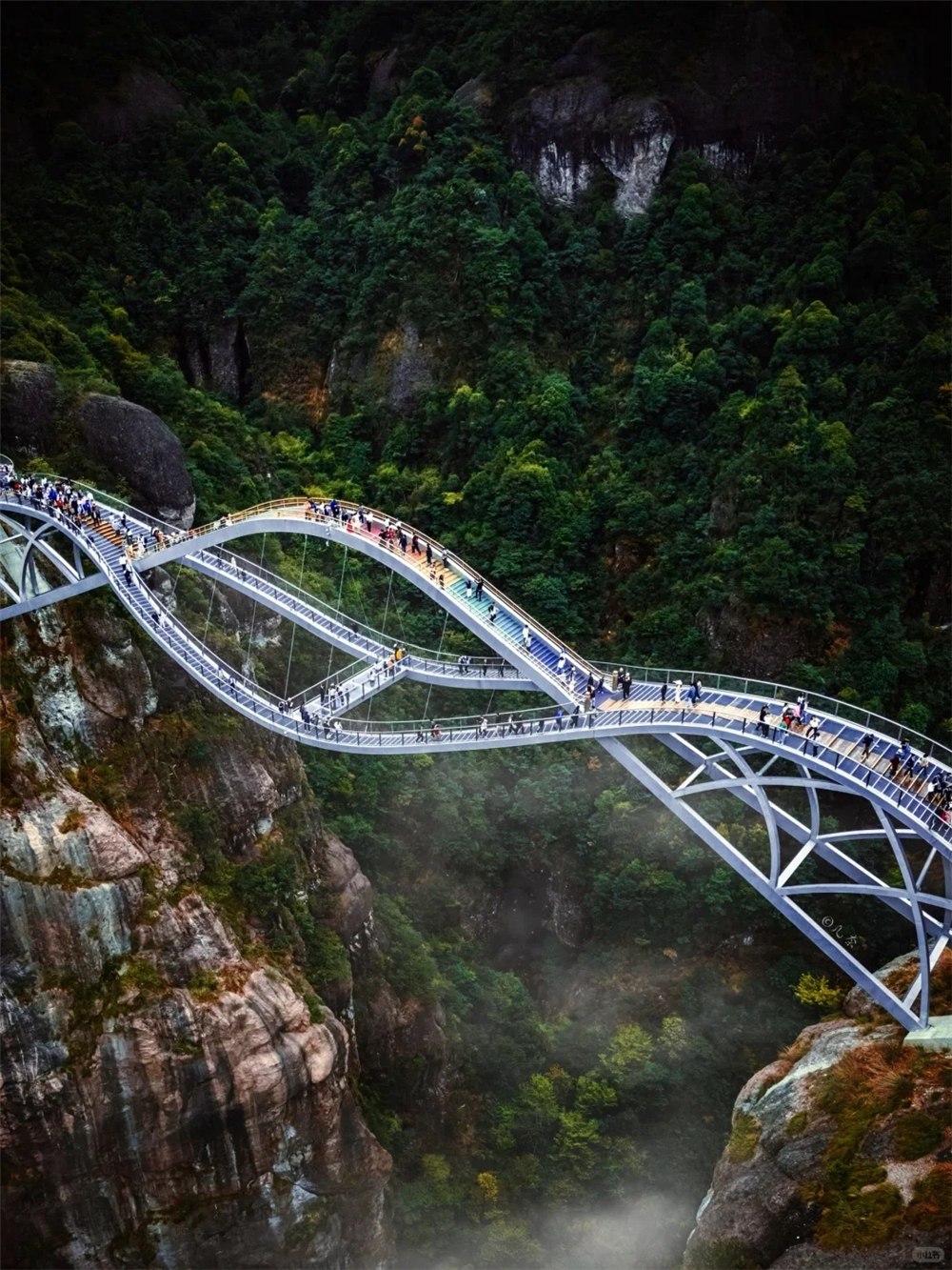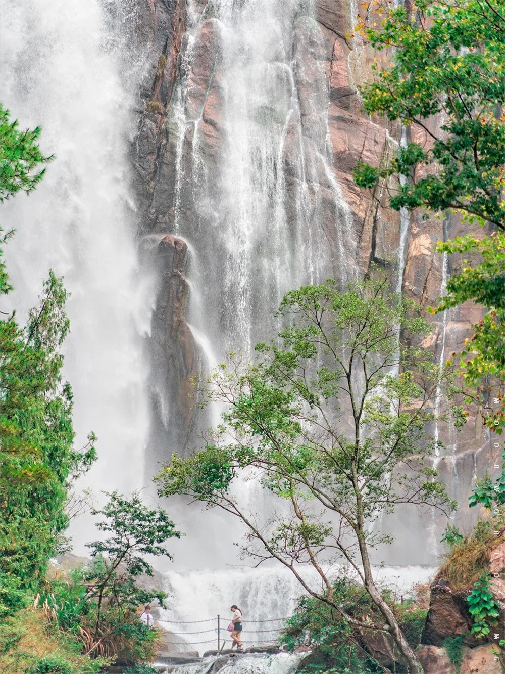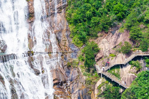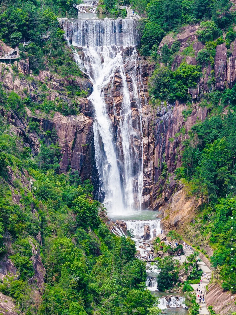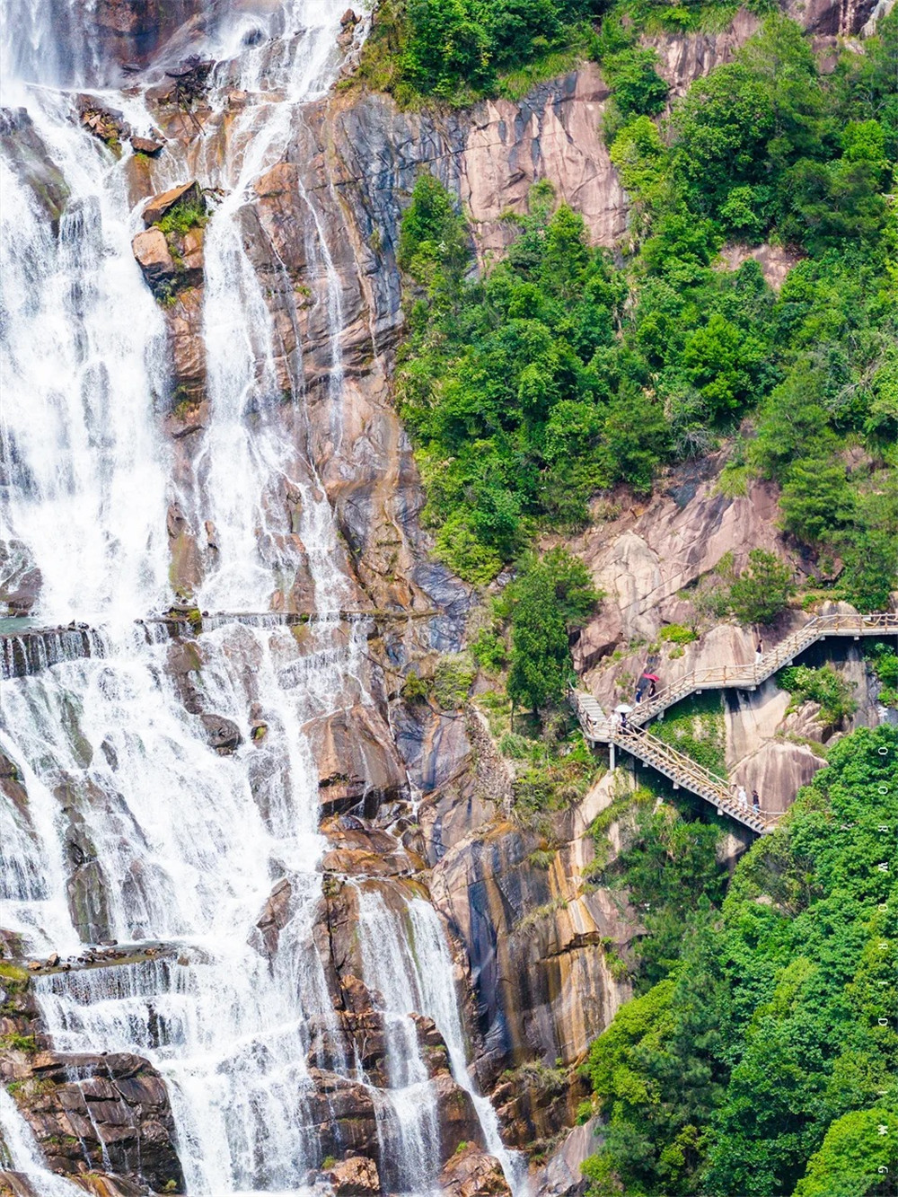 9:30 抵达起点天台大瀑布后,我们先进行游览。琼台仙谷景区,沿灵溪而上,漫步在碧绿的八仙湖畔与凌云栈道之上。一路欣赏如刀劈斧削的花岗岩奇峰,寻找“李白题诗岩”和传说中八仙赏月的“仙人座”。步行至峡谷上方,通过悬于两山之间的玻璃悬索桥—会仙桥(*高空玻璃桥,重度恐高症慎入)。在此可俯瞰峡谷全景。过桥后沿着栈道一路漫步进入天台山大瀑布景区,身处瀑布群的上端,将以一种独特的“俯视”到“仰视”的视角,沿悬崖栈道逐级向下穿越九级梯瀑。近距离感受每一级瀑布的形态,并最终从轰鸣的水帘后穿过,抵达瀑布底端。